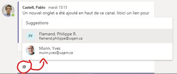 - mentionne les équipes et les canaux auxquels vous appartenez (@canal) ;