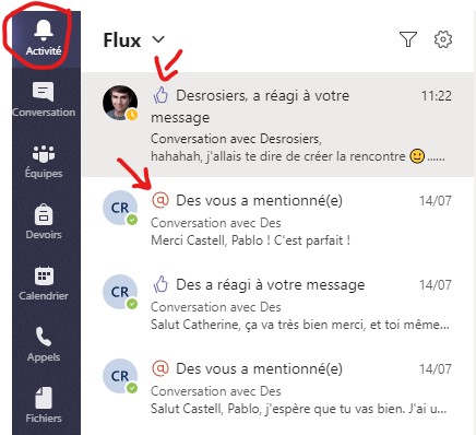 - vous mentionne (@mentions). Vous verrez également vos @mentions dans la conversation, où vous pourrez les repérer facilement ;