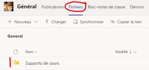 Pour ajouter des documents, il suffit de rentre dans l’onglet fichier du canal général, choisir le dossier supports de cours et ajouter les documents désirés.