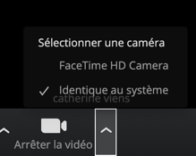 Accédez à la bande des options en bas de l’écran de la rencontre. Cliquez sur la petite flèche à droite de l’icône caméra. Sélectionnez la caméra disponible sur votre appareil.