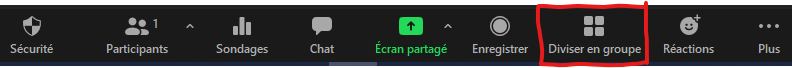 Oui, l’hôte de la réunion peut diviser en groupe ses participants en cliquant l’icône de la barre de tâches Zoom: