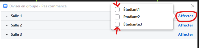 Ensuite, vous devez cliquer sur l’option Affecter qui s’affiche à droite du nom de la salle et choisir les participant.e.s que vous voulez envoyer dans la salle.