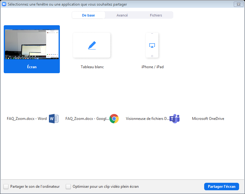 2.  Le participant doit choisir l’écran qu’il désire partager et dois cliquer sur Partager l’écran.